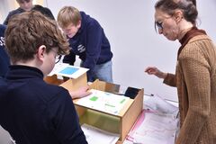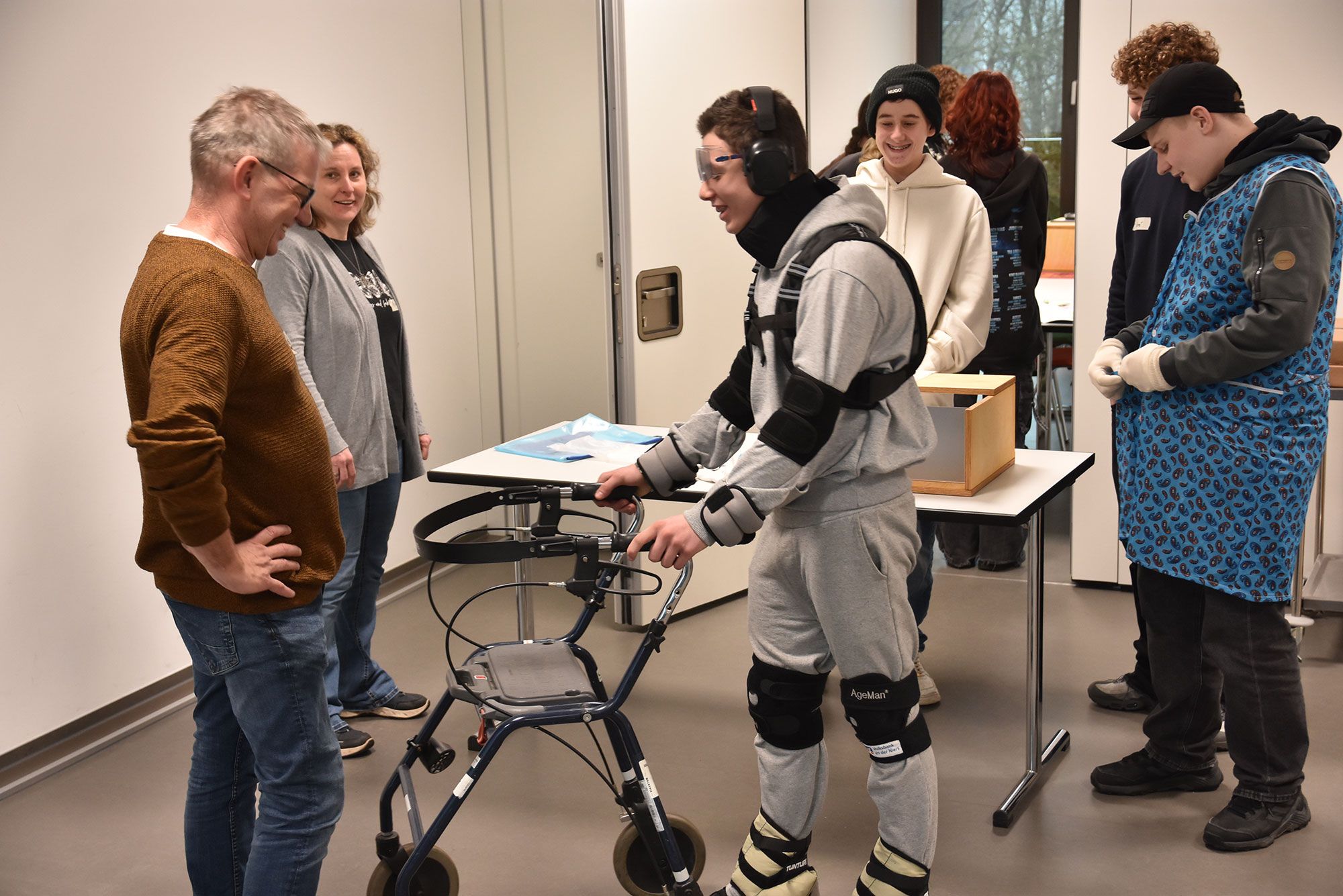 Ebenso beschwerlich wie eindrücklich waren die Versuche der Konfirmand:innen, leichte Geschicklichkeitsübungen unter erschwerten Bedingungen zu koordinieren. Zum Beispiel mit Handschuhen einen Kittel zuzuknöpfen, oder mit Messer und Gabel zu hantieren, wenn die Sicht erschwert ist. Wenn altersbedingt Konzentration, Koordination und Geschwindigkeit nachlassen, kann selbst das Zubereiten vom morgendlichen Frühstück eine längere Aktion werden, das zeigte ein Fotosuch- und Erinnerungsspiel.