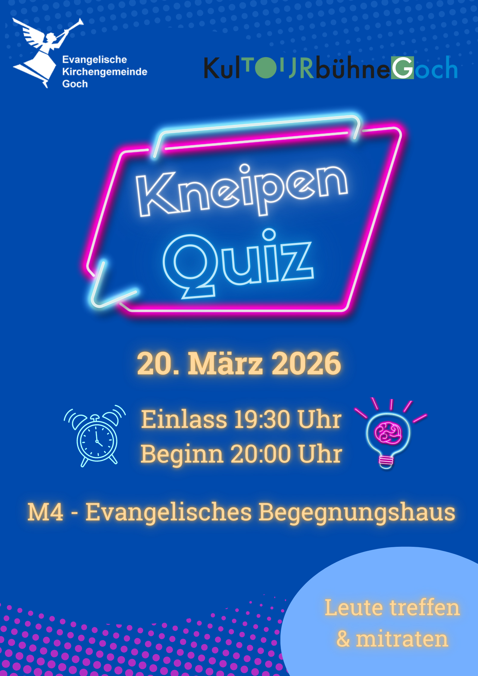 Die Evangelische Kirchengemeinde Goch und die Kulturbühne Goch laden zum Kneipenquiz ins M 4 - Evangelisches Begegnungshaus, Markt 4, 47574 Goch ein.