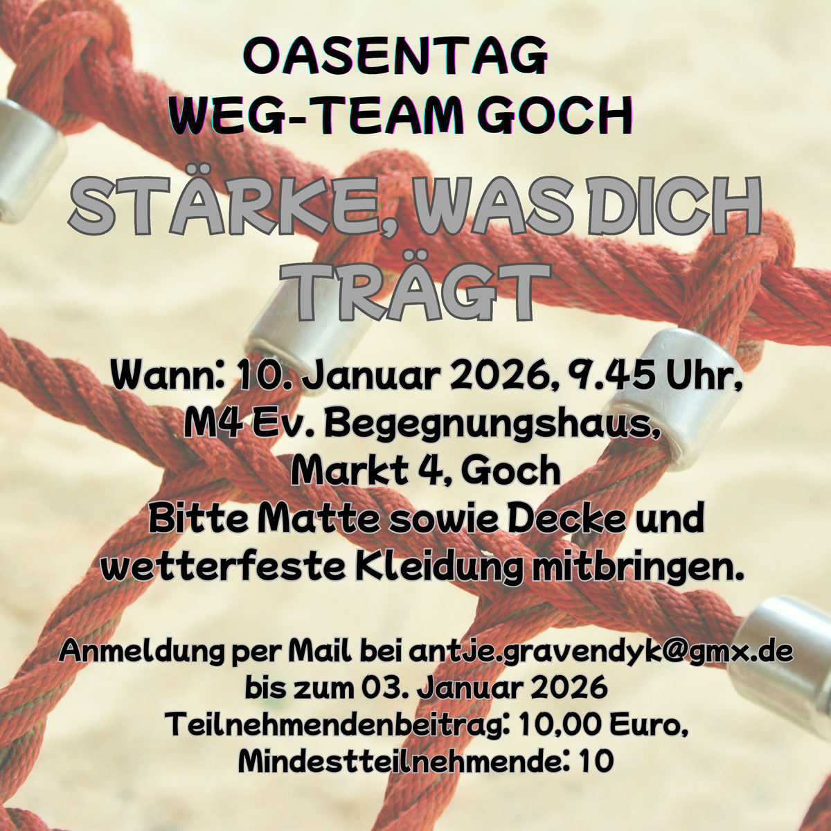 Wir beginnen am Samstag, den 10.01.2026 um 9.45 Uhr im evangelischen Begegnungshaus M4 am Markt in Goch mit einem gemeinsamen Stehkaffee, dann geht es nach einer Hinführung in einzelne Angebote. Nach dem Mittagessen steht der Nachmittag im Zeichen des Gottesdienstes. Den Abschluss bildet eine Kaffee- und Kuchenrunde. Für geistige und körperliche Nahrung ist gut gesorgt. Der Tag endet um ca. 17.00 Uhr. Interessierte können sich bis zum 03.01.2026 anmelden unter antje.gravendyk@gmx.de. Der Teilnahmebeitrag beläuft sich auf 10,00 Euro, es fallen keine weiteren Kosten an. Die Mindestteilnehmerzahl beträgt 10 Personen. Das gesamte WEG-Team Goch lädt alle Interessierten herzlich ein.