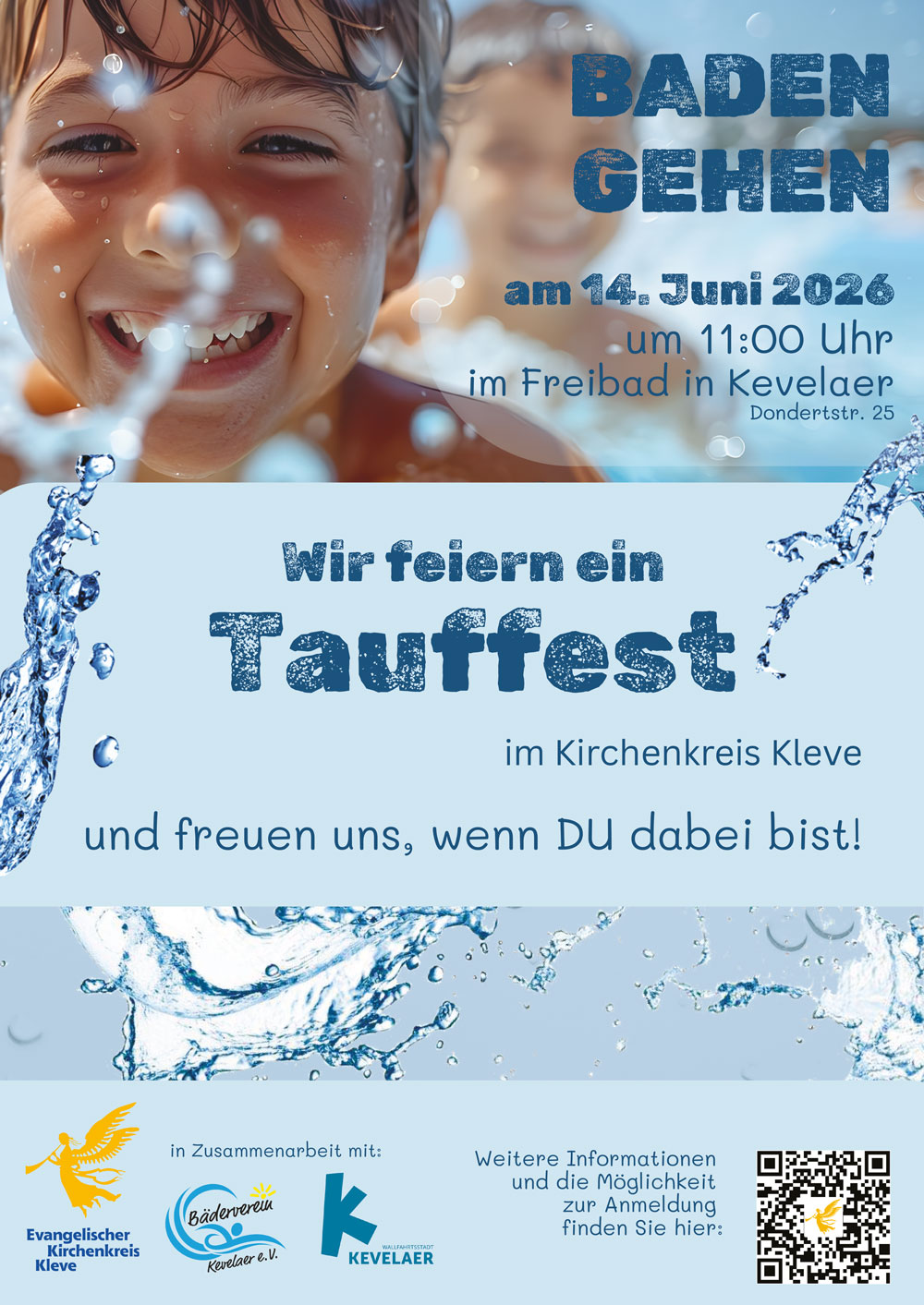 Direkt nach der Taufe eine Runde schwimmen gehen? Das ist möglich beim Tauffest in Kevelaer. Am 14. Juni ist es soweit, um 11:00 Uhr beginnt das evangelische Tauffest im Kirchenkreis nach der regionale Premiere 2025. Familien und Täuflinge sind mit ihren Eltern im Freibad an der Dondertstraße herzlich willkommen. Eine Kleiderordnung gibt es nicht, jeder kommt wie er oder sie es mag. Ob im Anzug oder im Badedress, oder eins nach dem anderen.