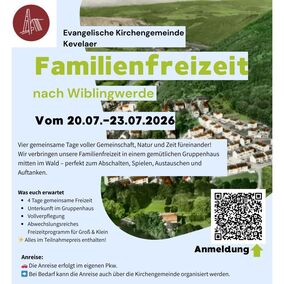 In der ersten Sommerferienwoche, vom 20. - 23 .Juli 2026, bietet die Evangelische Kirchengemeinde Kevelaer erstmalig eine Familienfreizeit nach Wiblingwerde an. Nachrod-Wiblingwerde ist eine Gemeinde in Nordrhein-Westfalen mit rund 6.000 Einwohnern. Sie liegt im Sauerland und gehört zum Märkischen Kreis. Gemeinsam möchten wir mit den Familien vier schöne Tage in einem Gruppenhaus mitten im Wald verbringen. Es wird zusammen gespielt, gelacht, die Natur genossen und Gemeinschaft erlebt.
