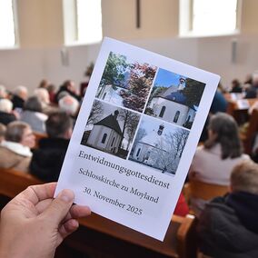 Bedburg-Hau. Da wurden doch einige Augen feucht: Als am Ende des Entwidmungsgottesdienstes in Moyland Mitglieder des Presbyteriums auf die Leiter stiegen, das Kreuz in der der Schlosskirche abnahmen und bei trauriger Orgelmusik auf den Abendmahlstisch legten, wurde es greifbar: Das war der letzte Akt der Evangelischen Kirchengemeinde Moyland in der Schlosskirche.