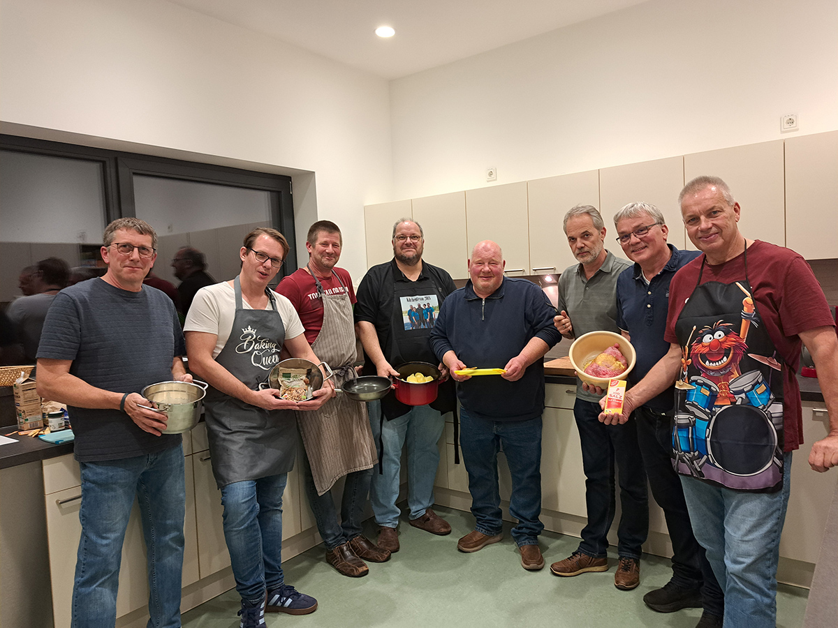 Ein kurzer Blick genügte, um zu sehen, dass die Männer nicht zum ersten Mal hinter dem Herd stehen und eine gewisse Erfahrung vorhanden ist. Hilfesuchend untätig stand zumindest keiner in der Küche. Salat wurde ansprechend zubereitet, als Hauptgericht standen im November Königsberger Klopse auf dem Zettel, Grießbrei mit geschmortem Apfel bildete den krönenden Abschluss. Die Kosten für den Einkauf werden nachher auf die Teilnehmenden umgelegt.