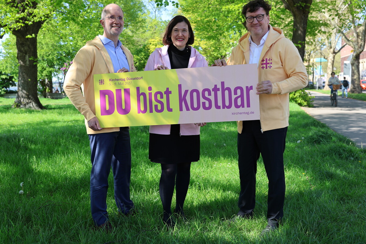 Düsseldorf (22. April 2026). Ein Jahr vor Beginn des 40. Deutschen Evangelischen Kirchentages 2027 ist heute in Düsseldorf das Hauptmotiv der entsprechenden Kampagne vorgestellt worden. Gemeinsam präsentierten Stadt, Landeskirche und Kirchentag das visuelle und inhaltliche Konzept, das die Agentur Arndtteunissen aus der Losung „Du bist kostbar“ (Jes 43,4) entwickelte.