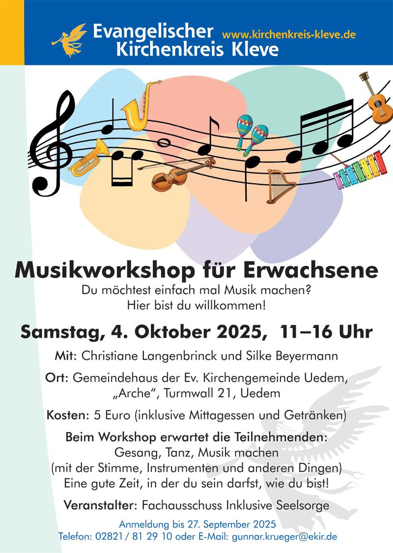 Uedem. Zum Musikworkshop für Erwachsene lädt der Fachausschuss „Inklusive Seelsorge“ des Evangelischen Kirchenkreises Kleve ein. Am kommenden Samstag, 4. Oktober, beginnt der Workshop ab 11 Uhr im Gemeindehaus der Ev. Kirchengemeinde Uedem, Turmwall 21. Christiane Langenbrinck und Silke Beyermann möchten bis 16 Uhr mit den Teilnehmenden singen, tanzen und musizieren. Sie gehen individuell auf die Möglichkeiten der Teilnehmenden ein, Voraussetzungen für die Teilnahme gibt es nicht. Zumindest ein Instrument hat jeder dabei: die eigene Stimme. Es werden einige Instrumente zur Verfügung stehen, eigene dürfen mitgebracht werden. Für den Workshop wird eine Teilnahmegebühr von 5 Euro, inklusive einem Mittagessen, erhoben. Sie kann vor Ort bezahlt werden. Wer teilnehmen möchte, meldet sich schnellstmöglich bei Gunnar Krüger per E-Mail: gunnar.krueger@ekir.de oder telefonisch 02821 / 81 29-10.