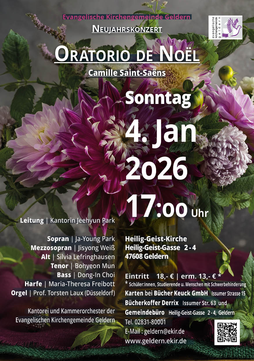 Die Evangelische Kirchengemeinde Geldern lädt zum Neujahrskonzert am 4. Januar 2026 um 17:00 Uhr in die Heilig-Geist-Kirche ein. Der festlichen Auftakt des neuen Jahres ist geprägt von der Eleganz und Tiefgründigkeit der französischen Musik. Im Mittelpunkt stehen vier herausragende Komponisten des 19. Jahrhunderts – César Franck, Gabriel Fauré, Alphonse Hasselmans und Camille Saint-Saëns. Ihre Werke vereinen die Vielfalt französischer Klangfarben.
