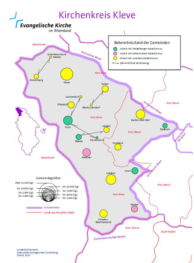 Zur Evangelischen Kirche im Rheinland gehören 34 Kirchenkreise, Kleve ist einer davon. Einige Kirchengemeinden haben Zusammenschlüsse vollzogen, so dass ab Januar 2026 die Zahl der Gemeinden in der Evangelischen Kirche im Rheinland auf 527 Kirchengemeinden gesunken ist.
