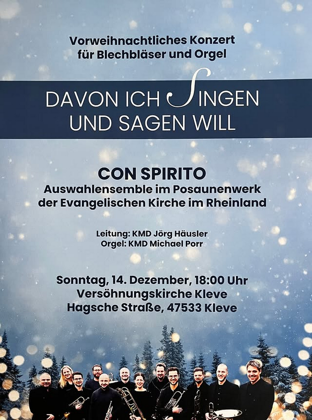 Con Spirito, das Auswahlensemble des Posaunenwerks der Evangelischen Kirche im Rheinland gastiert am 3. Advent um 18 Uhr in der ….-kirche, Kleve.