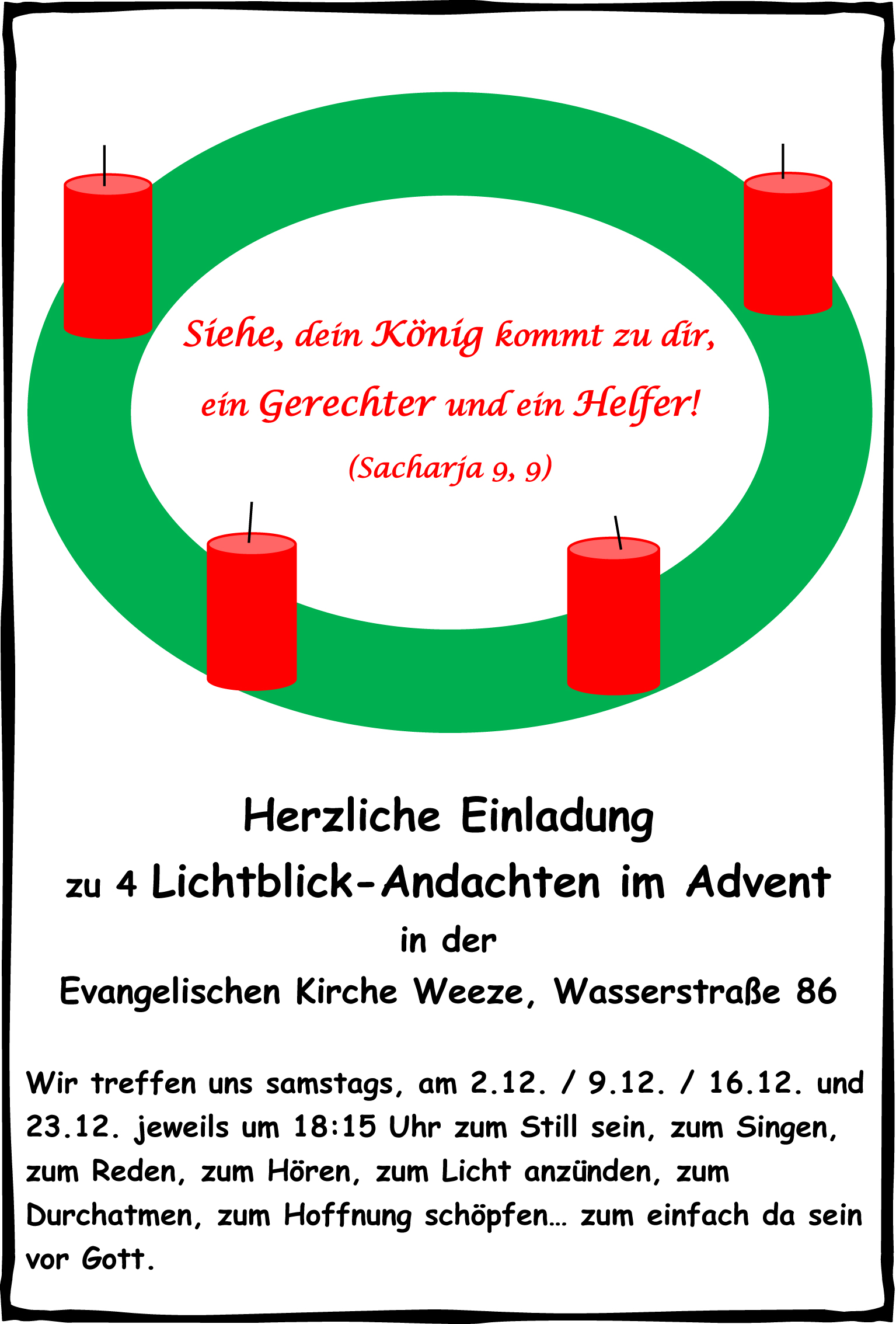 jeweils um 18:15 Uhr zum Still-sein, zum Singen, zum Reden, zum Hören, zum Licht anzünden, zum Durchatmen, zum Hoffnung schöpfen… zum einfach da sein vor Gott.