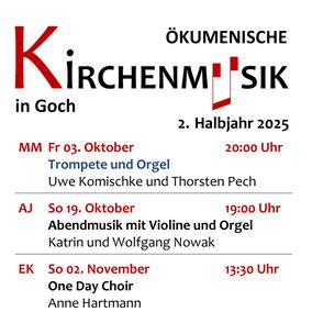 In Goch werden Konzertveranstaltungen im Flyer Ökumenische Kirchenmusik beworben. Veranstaltungen finden in der evangelischen Kirche am Markt oder dem dortigen Ev. Begegnungshaus M4, in der Maria-Magdalena-Kirche (Kirchhof) oder der Arnold-Janssen Kirche (Voßheider Straße) statt. Bis zum Ende des Jahres warten noch einige interessante Veranstaltungen.